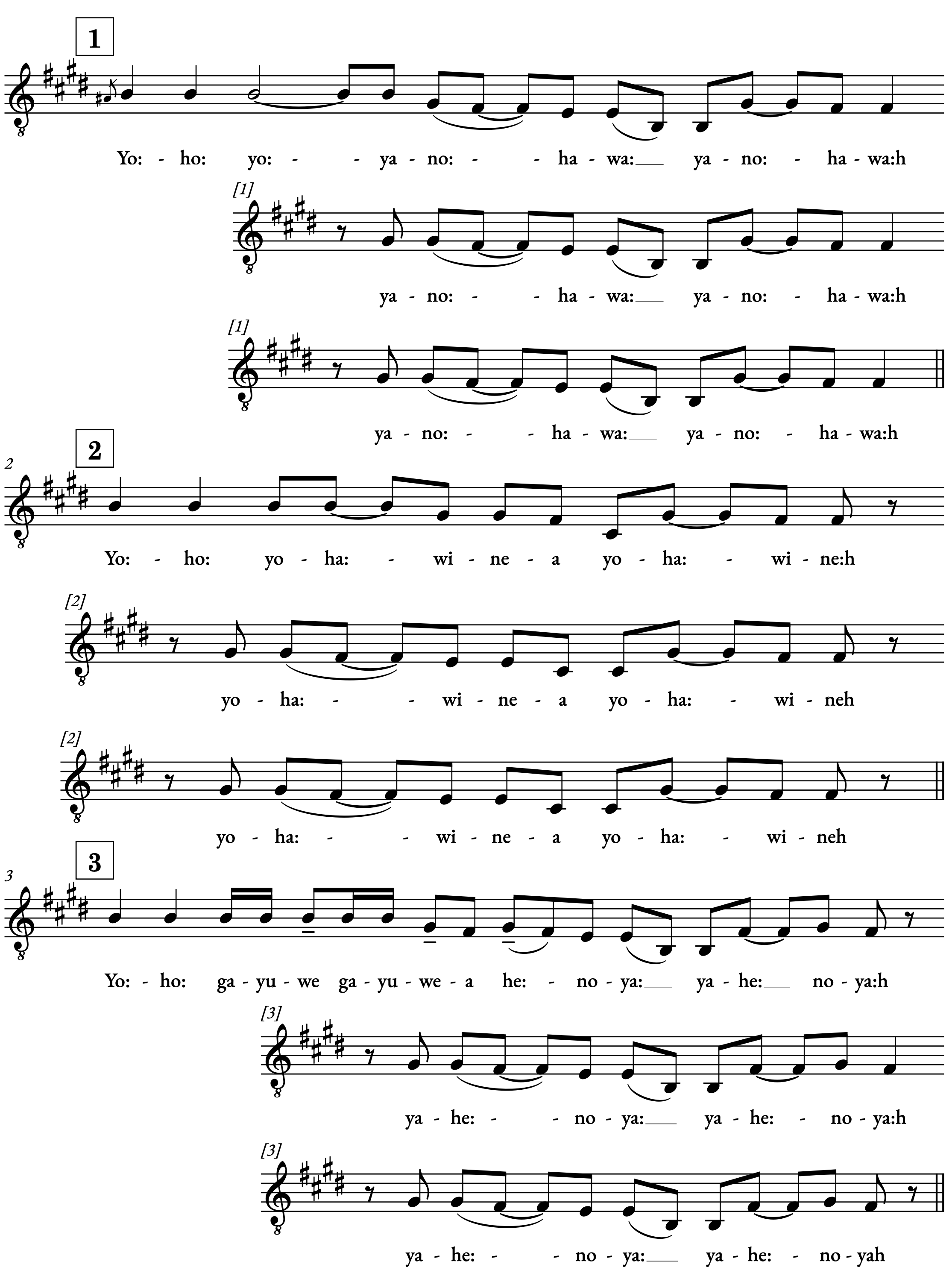 The melody in song 1 (music example 1) begins with repeated long one-beat notes (transcribed as quarter notes) on yo:ho, on sol (̂5), then moves down to a syncopated pattern on mi–re, followed by a dip down to low sol and back up to the middle register. There are three melodic phrases, and the second and third repeat the last portion of the first. This structure could be analyzed A-A′-A′ or AB-B-B.