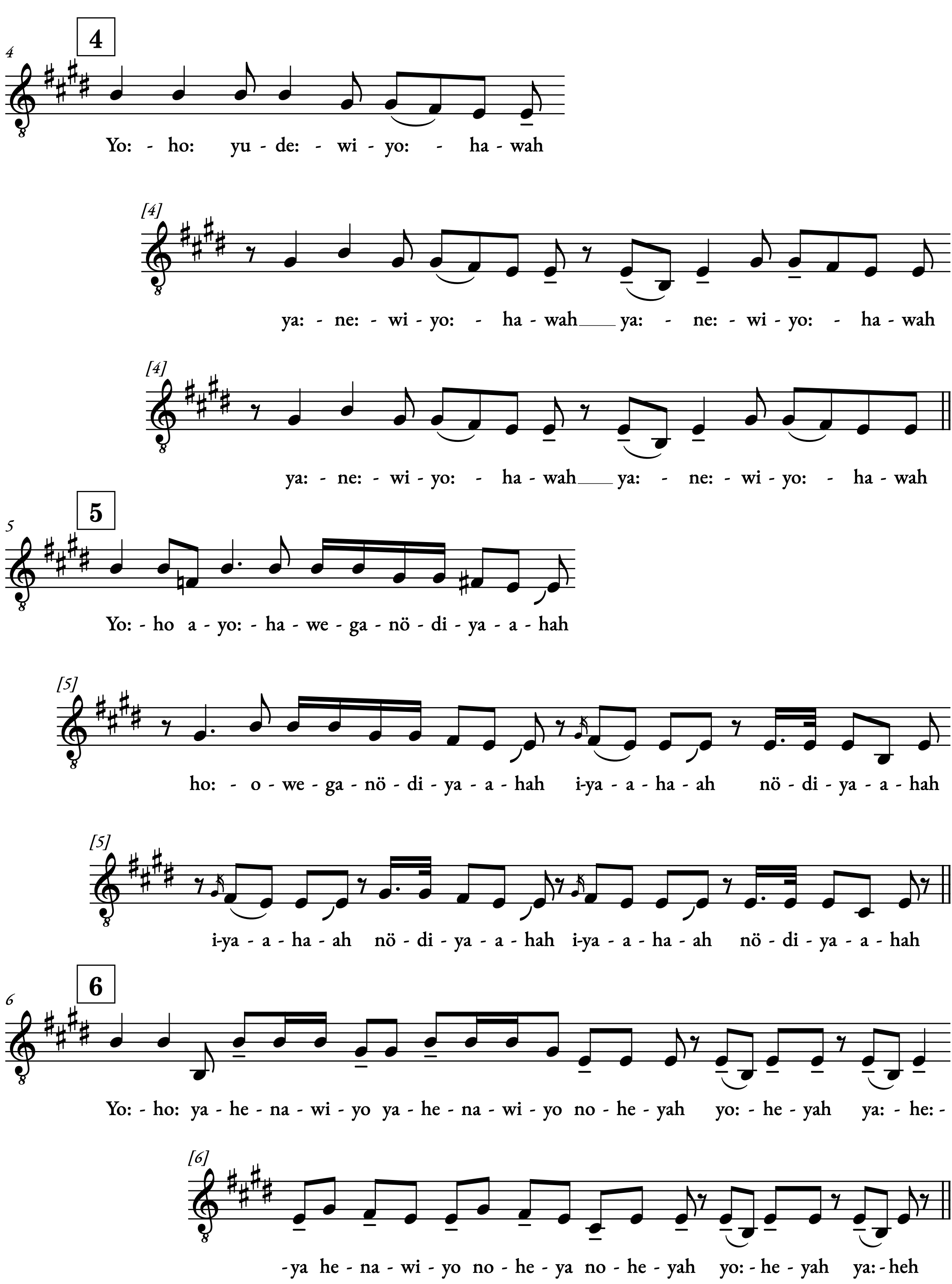 The set begins with a slow introduction in free time, started by the lead singer and continued by the whole group. This introduction lays out the basic shape of the melody that will recur in all the songs. This melody includes a smaller collection of pitches than some other songs (table 1): just do, re, mi, and sol or la (songs 5 and 6 include both). Though under Western training Andrew thinks of these pitches as belonging to a scale starting on E, the songs actually emphasize B much more strongly, both by stress and by including both the lower and higher B. When Robin Dance is sung in a reverberant space like the cookhouse used for both 2002 and 2022 Allegany Singers recordings, the repetition of only four or five notes, in short, looping phrases with brief rests between, greatly reinforces the overtones resonating in the room to where Andrew found he could clearly hear the melody an octave and sometimes even two octaves higher resounding in the space.