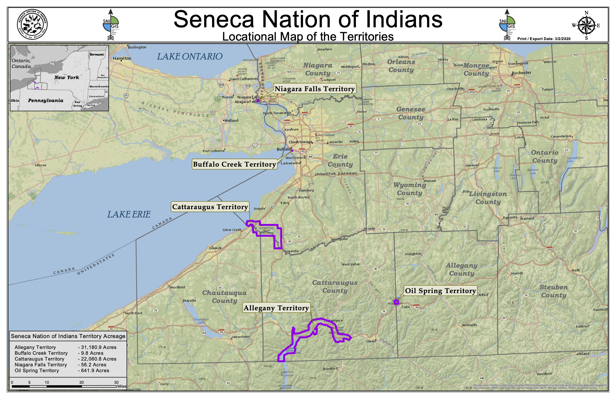 - the Seneca Nation of Indians, three primary territories (Allegany, Cattaraugus, and Oil Spring) within southwestern New York State (US); government headquarters in Salamanca, NY; 8,000 enrolled members (figure 1)